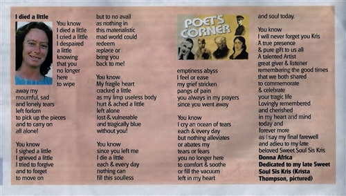 My heartfelt poem, "I died a little" dedicated to my beloved late sister Krista